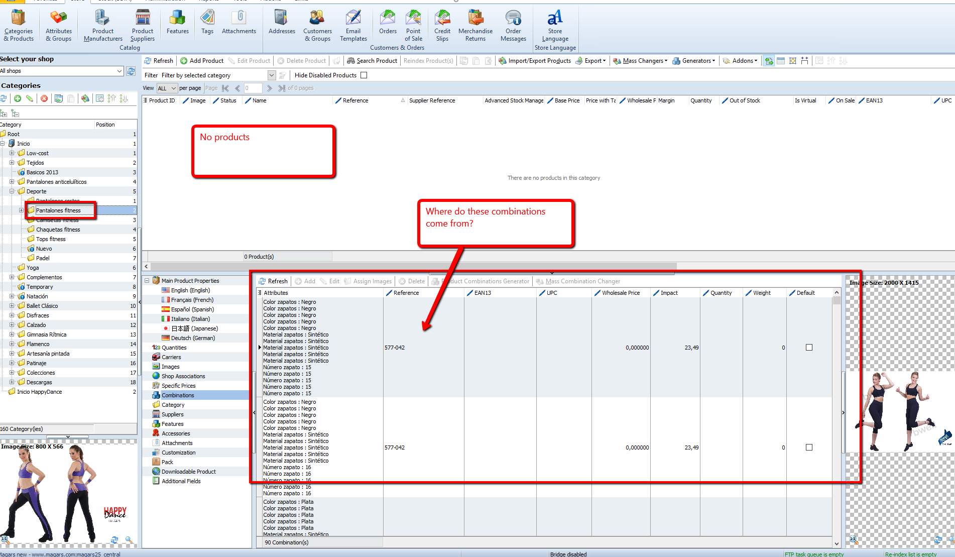 I think there must be a bug in some query with the combinations, because this is very strange: on most of my empty categories (they only have subcategories with products) a bunch of combinations load on the combinations tab that are from product that do not belong to any of the subcategories of current category. The combinations tab should be totally empty in this situation.